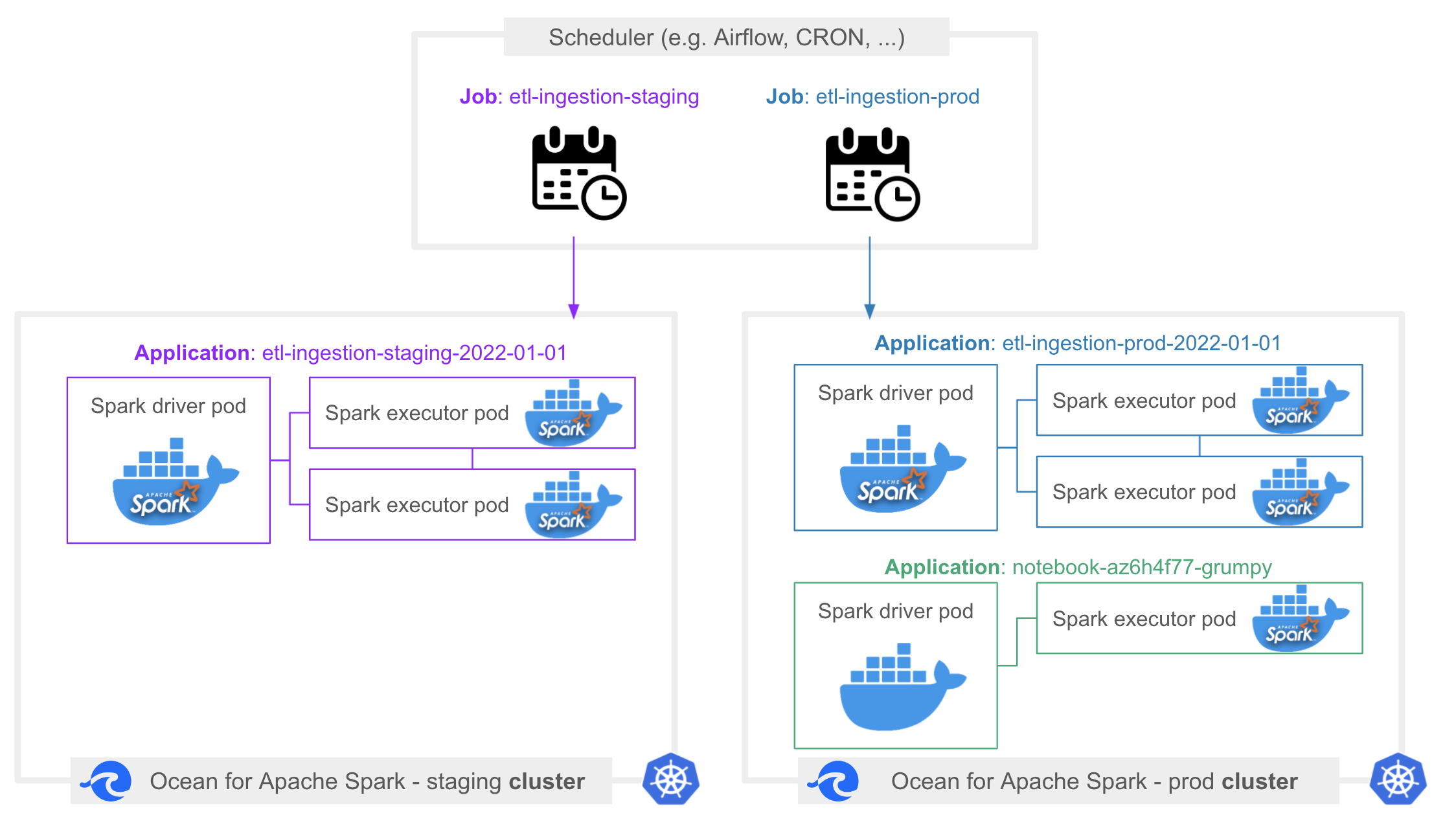 Clusters make up the compute infrastructure on which your Spark applications run. These Kubernetes clusters are typically long-running clusters. After initially provisioning them, most people let them run 24x7. Clusters do not have a fixed size. Ocean takes care of automatically scaling them up and down (by adding or removing nodes, based on the load), so that your costs are minimized if few or no Spark applications are running.